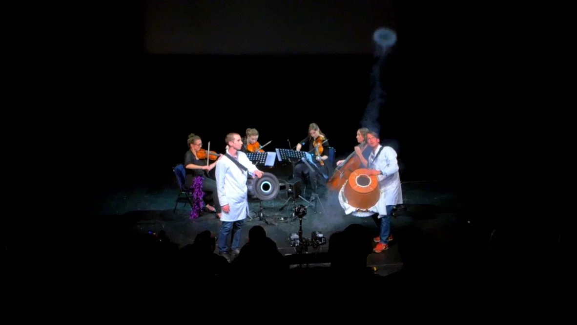 I send out a musical smoke ring during The Sense Ensemble Study #2 in the Samuel Beckett Theatre, Dublin, with Neimhin Robinson and the Crash Ensemble in September 2017.